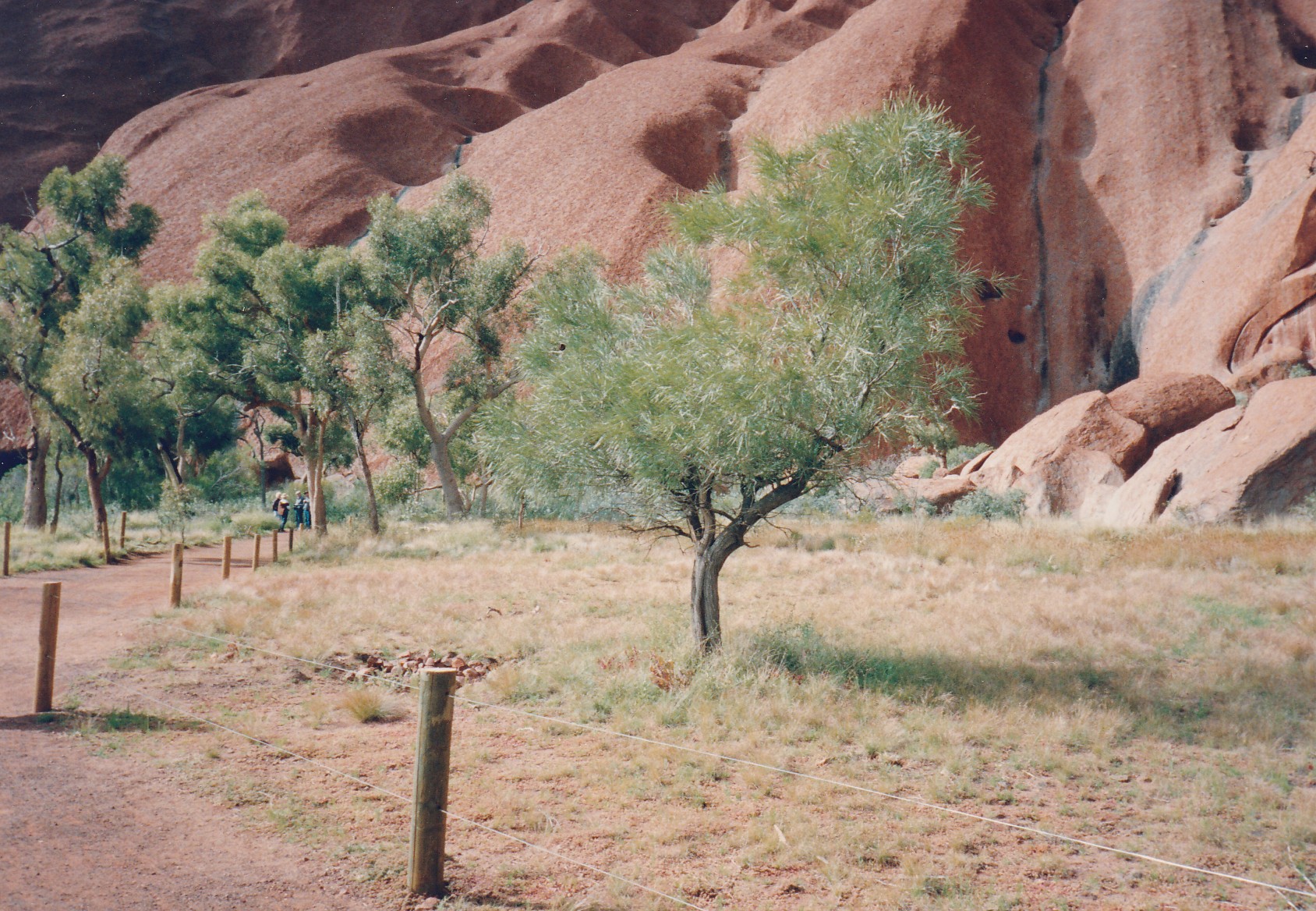 Up to catch the bus at 8.30am on Edible Desert Tour. Quite good but would have liked more input from Pintinjarra people Cassidy and Tikku. Saw weapons and bowls etc. water bowl, baby bowl, winnowing bowl, flynet and head band for carrying bowl. Man had human hair belt to carry boomerangs and 6 spears. Nulla Nulla – Kill carried round shoulders. Women provided 80% of food and 90% of time. Aphids on mulga – food for honey ants. Witchetty grubs in mulga root can tell by sawdust and noise if grub is there. Dig through crust with digging stick use winnowing bowl for shovel. Showed us winnowing of seeds. Drug made from powdered leaves from tobacco bush-ash from spinifex and leaves from the grevillia. Hold under lip and sucking through teeth. Used to keep up spirits on long walks, social drug. Man had a spear made from vine bound with kangaroo sinew moistened to bind. Resin on Nulla Nulla was from spinifex and fibre from mulga tree. Vine was straightened over a fire. Spear in one piece was punishment spear. Put through persons leg – if cant walk you fall behind and die. Serious crime through the kidneys. Water available in pig face like plant. Sheoak in fork of branches, root of tree. Came back and went for a drive to Uluru. Walked around base, quite impressive. Caves, gorge with waterfall when it rains. Back for lunch and then to Olgas or Kata Tjuta. Really wonderful. Tremendous number of plants, through valley of the winds and across middle basin to lookout. Very lush in the centre. Magnificent towering rocks at each side. Great boulders of conglomerate, very spectacular. Like walking through Uluru. Originally would have been a much larger version of Uluru. Really wonderful. Home by 6.30pm then dined at a Grill in Yulara. Good meal home to bed.
