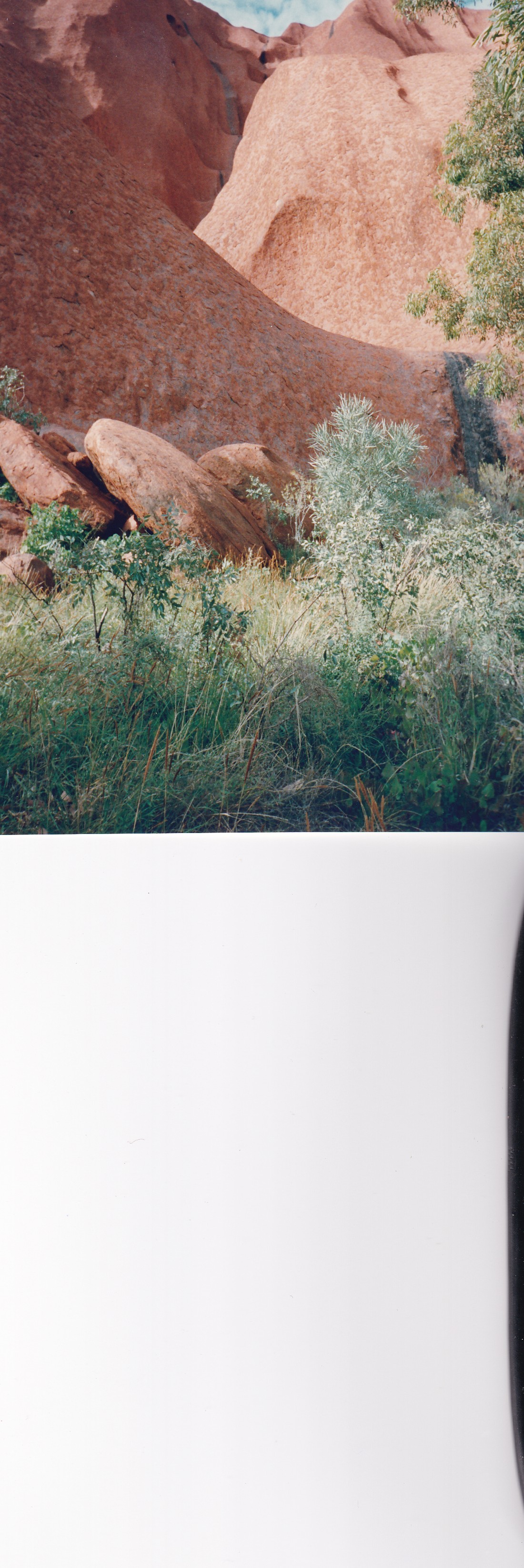 Up to catch the bus at 8.30am on Edible Desert Tour. Quite good but would have liked more input from Pintinjarra people Cassidy and Tikku. Saw weapons and bowls etc. water bowl, baby bowl, winnowing bowl, flynet and head band for carrying bowl. Man had human hair belt to carry boomerangs and 6 spears. Nulla Nulla – Kill carried round shoulders. Women provided 80% of food and 90% of time. Aphids on mulga – food for honey ants. Witchetty grubs in mulga root can tell by sawdust and noise if grub is there. Dig through crust with digging stick use winnowing bowl for shovel. Showed us winnowing of seeds. Drug made from powdered leaves from tobacco bush-ash from spinifex and leaves from the grevillia. Hold under lip and sucking through teeth. Used to keep up spirits on long walks, social drug. Man had a spear made from vine bound with kangaroo sinew moistened to bind. Resin on Nulla Nulla was from spinifex and fibre from mulga tree. Vine was straightened over a fire. Spear in one piece was punishment spear. Put through persons leg – if cant walk you fall behind and die. Serious crime through the kidneys. Water available in pig face like plant. Sheoak in fork of branches, root of tree. Came back and went for a drive to Uluru. Walked around base, quite impressive. Caves, gorge with waterfall when it rains. Back for lunch and then to Olgas or Kata Tjuta. Really wonderful. Tremendous number of plants, through valley of the winds and across middle basin to lookout. Very lush in the centre. Magnificent towering rocks at each side. Great boulders of conglomerate, very spectacular. Like walking through Uluru. Originally would have been a much larger version of Uluru. Really wonderful. Home by 6.30pm then dined at a Grill in Yulara. Good meal home to bed.