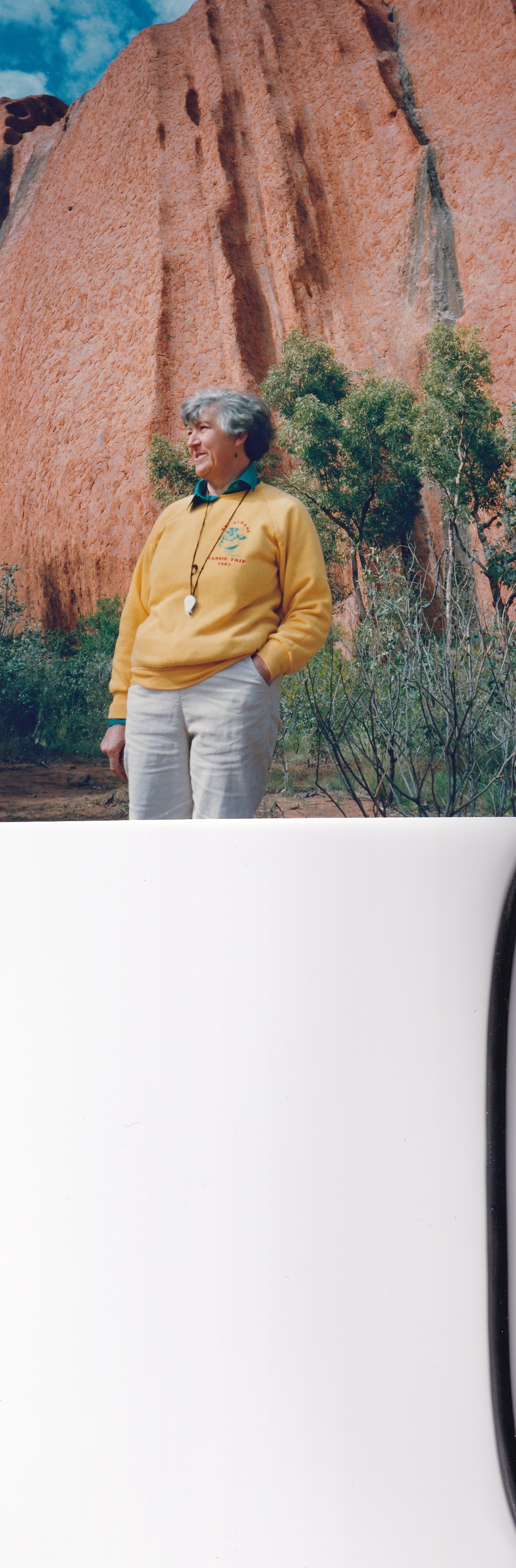 Up to catch the bus at 8.30am on Edible Desert Tour. Quite good but would have liked more input from Pintinjarra people Cassidy and Tikku. Saw weapons and bowls etc. water bowl, baby bowl, winnowing bowl, flynet and head band for carrying bowl. Man had human hair belt to carry boomerangs and 6 spears. Nulla Nulla – Kill carried round shoulders. Women provided 80% of food and 90% of time. Aphids on mulga – food for honey ants. Witchetty grubs in mulga root can tell by sawdust and noise if grub is there. Dig through crust with digging stick use winnowing bowl for shovel. Showed us winnowing of seeds. Drug made from powdered leaves from tobacco bush-ash from spinifex and leaves from the grevillia. Hold under lip and sucking through teeth. Used to keep up spirits on long walks, social drug. Man had a spear made from vine bound with kangaroo sinew moistened to bind. Resin on Nulla Nulla was from spinifex and fibre from mulga tree. Vine was straightened over a fire. Spear in one piece was punishment spear. Put through persons leg – if cant walk you fall behind and die. Serious crime through the kidneys. Water available in pig face like plant. Sheoak in fork of branches, root of tree. Came back and went for a drive to Uluru. Walked around base, quite impressive. Caves, gorge with waterfall when it rains. Back for lunch and then to Olgas or Kata Tjuta. Really wonderful. Tremendous number of plants, through valley of the winds and across middle basin to lookout. Very lush in the centre. Magnificent towering rocks at each side. Great boulders of conglomerate, very spectacular. Like walking through Uluru. Originally would have been a much larger version of Uluru. Really wonderful. Home by 6.30pm then dined at a Grill in Yulara. Good meal home to bed.