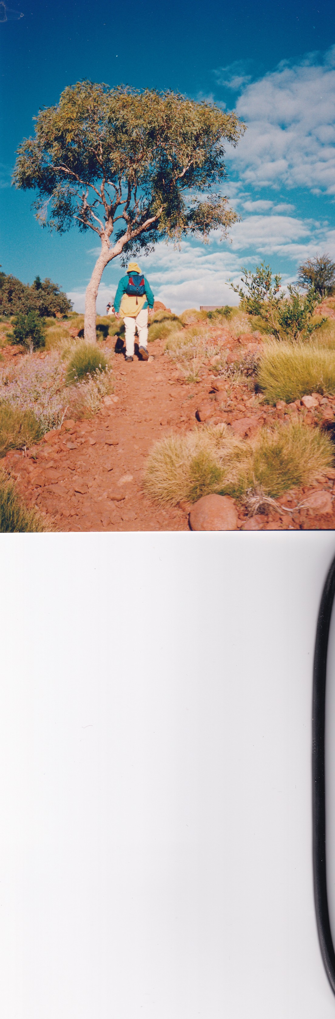 Up to catch the bus at 8.30am on Edible Desert Tour. Quite good but would have liked more input from Pintinjarra people Cassidy and Tikku. Saw weapons and bowls etc. water bowl, baby bowl, winnowing bowl, flynet and head band for carrying bowl. Man had human hair belt to carry boomerangs and 6 spears. Nulla Nulla – Kill carried round shoulders. Women provided 80% of food and 90% of time. Aphids on mulga – food for honey ants. Witchetty grubs in mulga root can tell by sawdust and noise if grub is there. Dig through crust with digging stick use winnowing bowl for shovel. Showed us winnowing of seeds. Drug made from powdered leaves from tobacco bush-ash from spinifex and leaves from the grevillia. Hold under lip and sucking through teeth. Used to keep up spirits on long walks, social drug. Man had a spear made from vine bound with kangaroo sinew moistened to bind. Resin on Nulla Nulla was from spinifex and fibre from mulga tree. Vine was straightened over a fire. Spear in one piece was punishment spear. Put through persons leg – if cant walk you fall behind and die. Serious crime through the kidneys. Water available in pig face like plant. Sheoak in fork of branches, root of tree. Came back and went for a drive to Uluru. Walked around base, quite impressive. Caves, gorge with waterfall when it rains. Back for lunch and then to Olgas or Kata Tjuta. Really wonderful. Tremendous number of plants, through valley of the winds and across middle basin to lookout. Very lush in the centre. Magnificent towering rocks at each side. Great boulders of conglomerate, very spectacular. Like walking through Uluru. Originally would have been a much larger version of Uluru. Really wonderful. Home by 6.30pm then dined at a Grill in Yulara. Good meal home to bed.