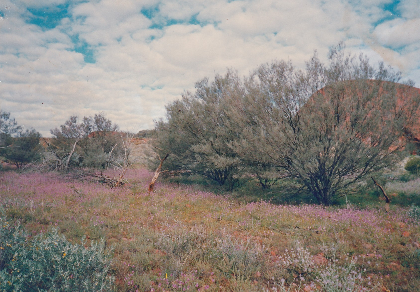 Up to catch the bus at 8.30am on Edible Desert Tour. Quite good but would have liked more input from Pintinjarra people Cassidy and Tikku. Saw weapons and bowls etc. water bowl, baby bowl, winnowing bowl, flynet and head band for carrying bowl. Man had human hair belt to carry boomerangs and 6 spears. Nulla Nulla – Kill carried round shoulders. Women provided 80% of food and 90% of time. Aphids on mulga – food for honey ants. Witchetty grubs in mulga root can tell by sawdust and noise if grub is there. Dig through crust with digging stick use winnowing bowl for shovel. Showed us winnowing of seeds. Drug made from powdered leaves from tobacco bush-ash from spinifex and leaves from the grevillia. Hold under lip and sucking through teeth. Used to keep up spirits on long walks, social drug. Man had a spear made from vine bound with kangaroo sinew moistened to bind. Resin on Nulla Nulla was from spinifex and fibre from mulga tree. Vine was straightened over a fire. Spear in one piece was punishment spear. Put through persons leg – if cant walk you fall behind and die. Serious crime through the kidneys. Water available in pig face like plant. Sheoak in fork of branches, root of tree. Came back and went for a drive to Uluru. Walked around base, quite impressive. Caves, gorge with waterfall when it rains. Back for lunch and then to Olgas or Kata Tjuta. Really wonderful. Tremendous number of plants, through valley of the winds and across middle basin to lookout. Very lush in the centre. Magnificent towering rocks at each side. Great boulders of conglomerate, very spectacular. Like walking through Uluru. Originally would have been a much larger version of Uluru. Really wonderful. Home by 6.30pm then dined at a Grill in Yulara. Good meal home to bed.