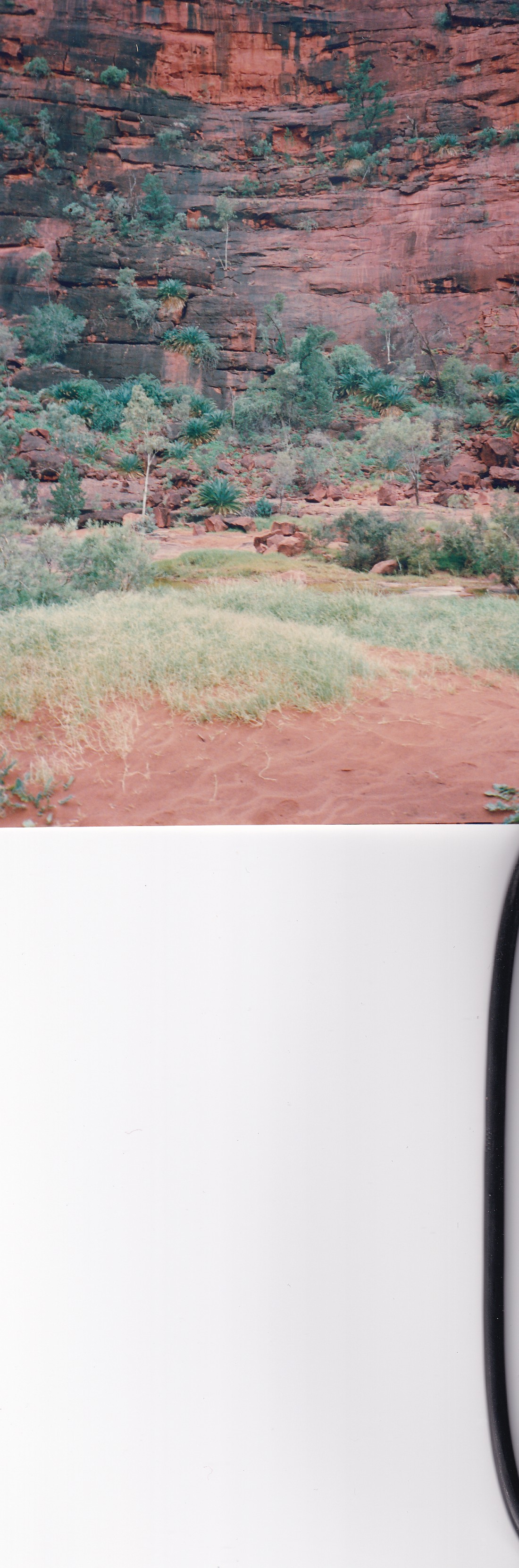 Up to catch the bus at 8.30am on Edible Desert Tour. Quite good but would have liked more input from Pintinjarra people Cassidy and Tikku. Saw weapons and bowls etc. water bowl, baby bowl, winnowing bowl, flynet and head band for carrying bowl. Man had human hair belt to carry boomerangs and 6 spears. Nulla Nulla – Kill carried round shoulders. Women provided 80% of food and 90% of time. Aphids on mulga – food for honey ants. Witchetty grubs in mulga root can tell by sawdust and noise if grub is there. Dig through crust with digging stick use winnowing bowl for shovel. Showed us winnowing of seeds. Drug made from powdered leaves from tobacco bush-ash from spinifex and leaves from the grevillia. Hold under lip and sucking through teeth. Used to keep up spirits on long walks, social drug. Man had a spear made from vine bound with kangaroo sinew moistened to bind. Resin on Nulla Nulla was from spinifex and fibre from mulga tree. Vine was straightened over a fire. Spear in one piece was punishment spear. Put through persons leg – if cant walk you fall behind and die. Serious crime through the kidneys. Water available in pig face like plant. Sheoak in fork of branches, root of tree. Came back and went for a drive to Uluru. Walked around base, quite impressive. Caves, gorge with waterfall when it rains. Back for lunch and then to Olgas or Kata Tjuta. Really wonderful. Tremendous number of plants, through valley of the winds and across middle basin to lookout. Very lush in the centre. Magnificent towering rocks at each side. Great boulders of conglomerate, very spectacular. Like walking through Uluru. Originally would have been a much larger version of Uluru. Really wonderful. Home by 6.30pm then dined at a Grill in Yulara. Good meal home to bed.