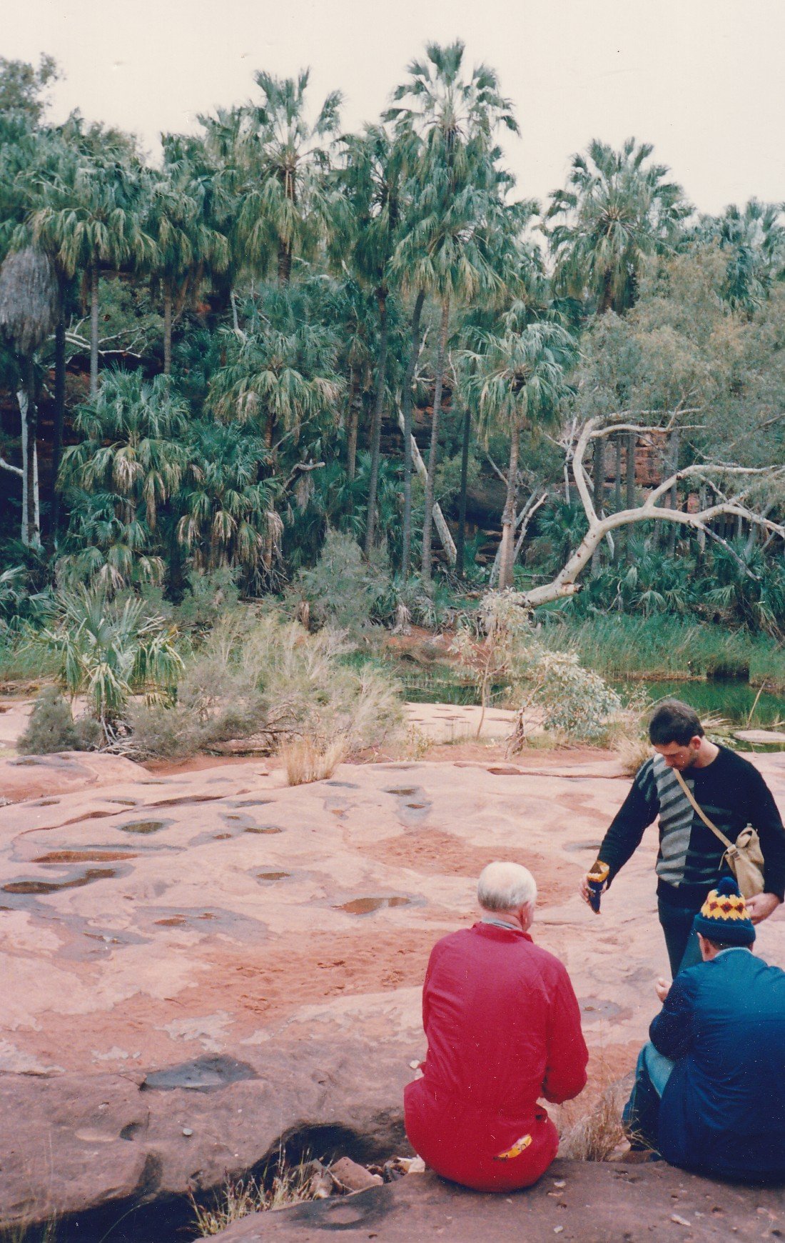 Up very early woke about 5am. Did a load of washing before breakfast. Left park by 9am. Shopped a bit (still Alice Show). Went to visit Telegraph Station. Beautful old stone buildings well furnished for a display. Lovely area surrounding. Todd River gum trees . Visited Arakuen Art Gallery, paintings, sculptues, and a good photographic exhibition by Peter Lattz Then we went out to Hermansburg mission. Old stone buildings again on one side. Aboriginal Store on the other side. Quite a contrast. Lot of vandalism in aborigine quarter. Had tea and scones with Barry. Bought music sticks and egg. Fabienne bargained unmercifully but didn’t get what she wanted. Then on to Palm Valley. Real 4WD. Sand, river beds, and rocks. Camped about 6pm. After illegally collecting wood. Cooked steak on the fire, star gazing. Rained during the night.