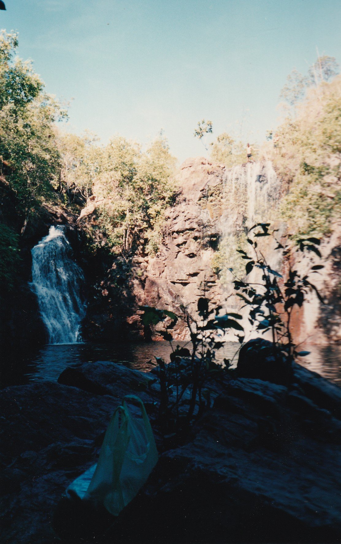 Exciting 4WD into Florence Falls. Should have been here last night. Walked in among the rainforest to another lovely falls. Swam in the water. Double Falls. Boys jumping from the top. Lovely start to the day. On into Batchelor- Rum Jungle across the highway to Cooinda before dark. Had our tea and went up for a drink at the Four Seasons Motel. Nice open bar, no mosquitoes.