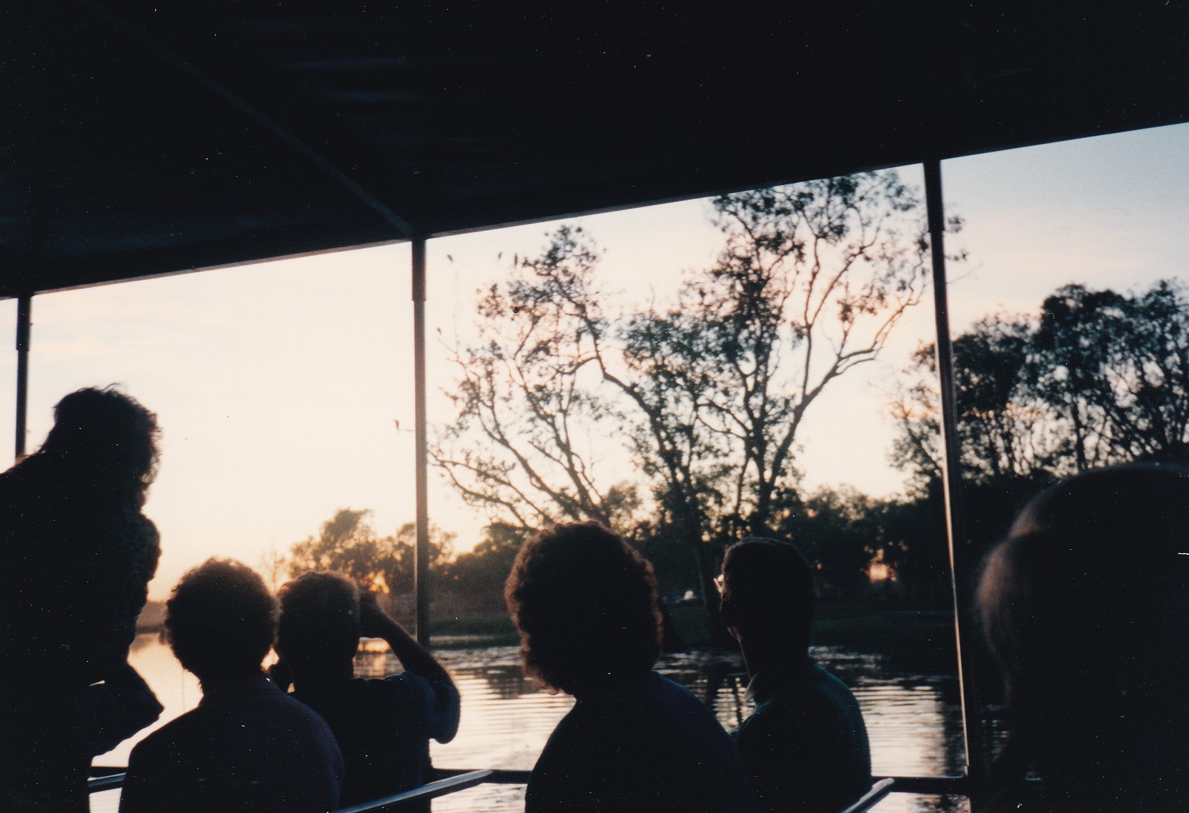 Up very early to go on morning cruise on Yellow Waters. Beautiful birds – named 26 species. Saw several crocodiles. Green native cress each side of billabong. Came back for breakfast at 9:00. Then loaded in Morris’s air conditioned vehicle and went to Jabiru, 1 hour waiting around shopping centre, pleasant and cool. Up to Ubirr Rock. Good art and view 360 degrees. Took panarama photo but ran out of film half way through. Shot took in ‘Hoges back yard’. Then we came back to Nourlangie Rock which also had good art Lightening Man and Barramundi, his wife and another. Home to Cooinda, mossquitoes very bad again.