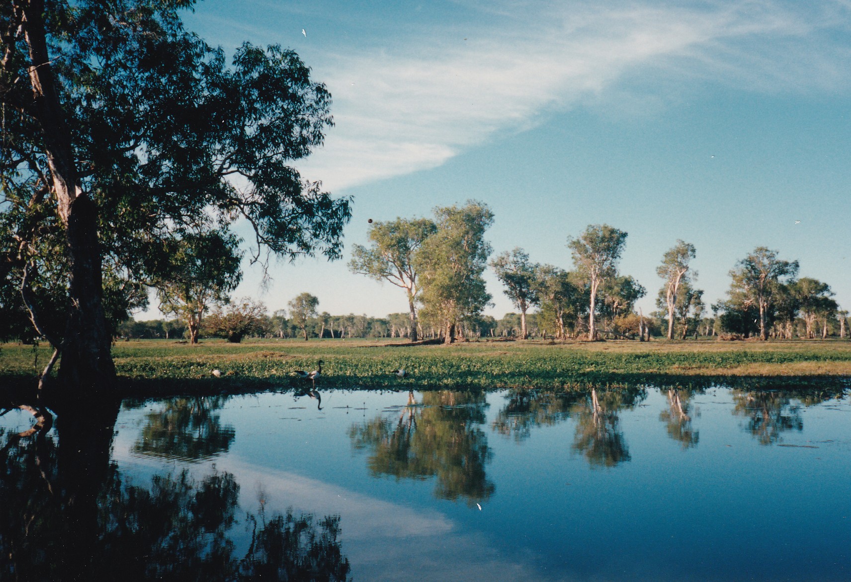 Up very early to go on morning cruise on Yellow Waters. Beautiful birds – named 26 species. Saw several crocodiles. Green native cress each side of billabong. Came back for breakfast at 9:00. Then loaded in Morris’s air conditioned vehicle and went to Jabiru, 1 hour waiting around shopping centre, pleasant and cool. Up to Ubirr Rock. Good art and view 360 degrees. Took panarama photo but ran out of film half way through. Shot took in ‘Hoges back yard’. Then we came back to Nourlangie Rock which also had good art Lightening Man and Barramundi, his wife and another. Home to Cooinda, mossquitoes very bad again.