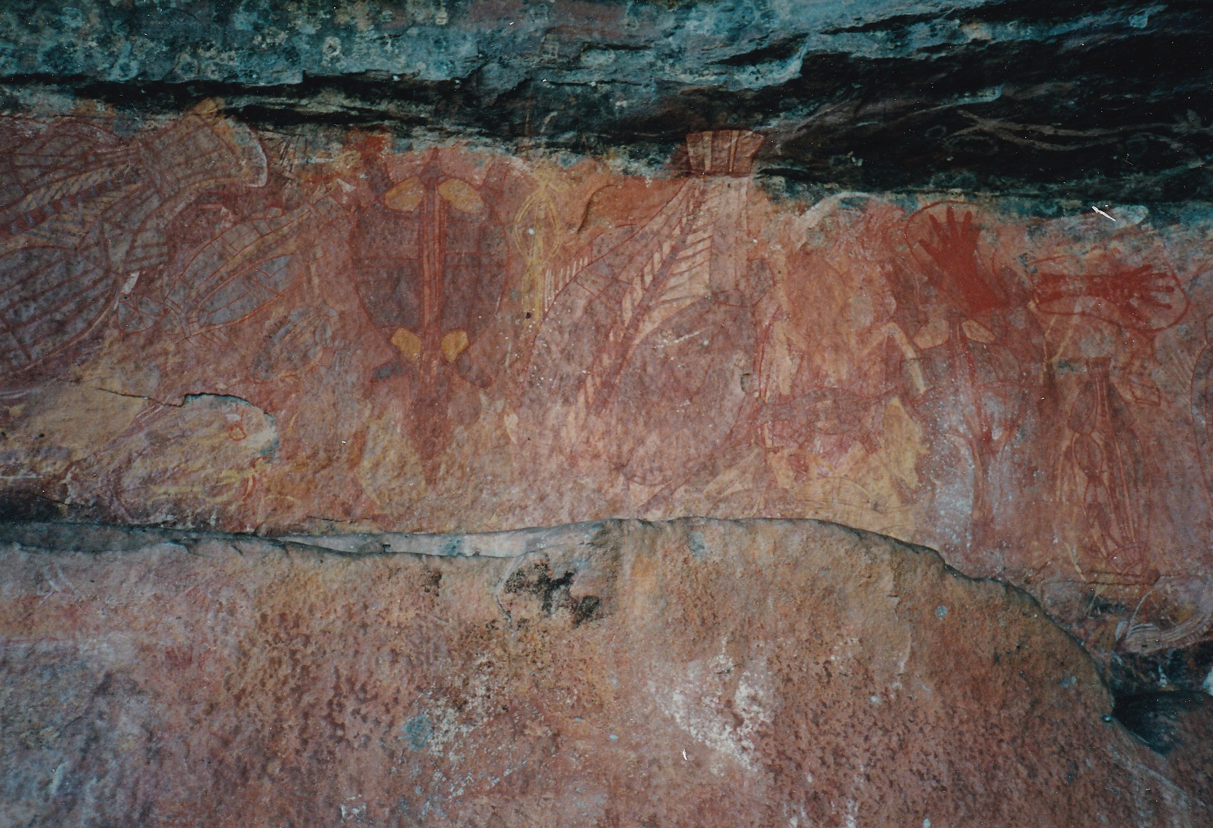 Up very early to go on morning cruise on Yellow Waters. Beautiful birds – named 26 species. Saw several crocodiles. Green native cress each side of billabong. Came back for breakfast at 9:00. Then loaded in Morris’s air conditioned vehicle and went to Jabiru, 1 hour waiting around shopping centre, pleasant and cool. Up to Ubirr Rock. Good art and view 360 degrees. Took panarama photo but ran out of film half way through. Shot took in ‘Hoges back yard’. Then we came back to Nourlangie Rock which also had good art Lightening Man and Barramundi, his wife and another. Home to Cooinda, mossquitoes very bad again.