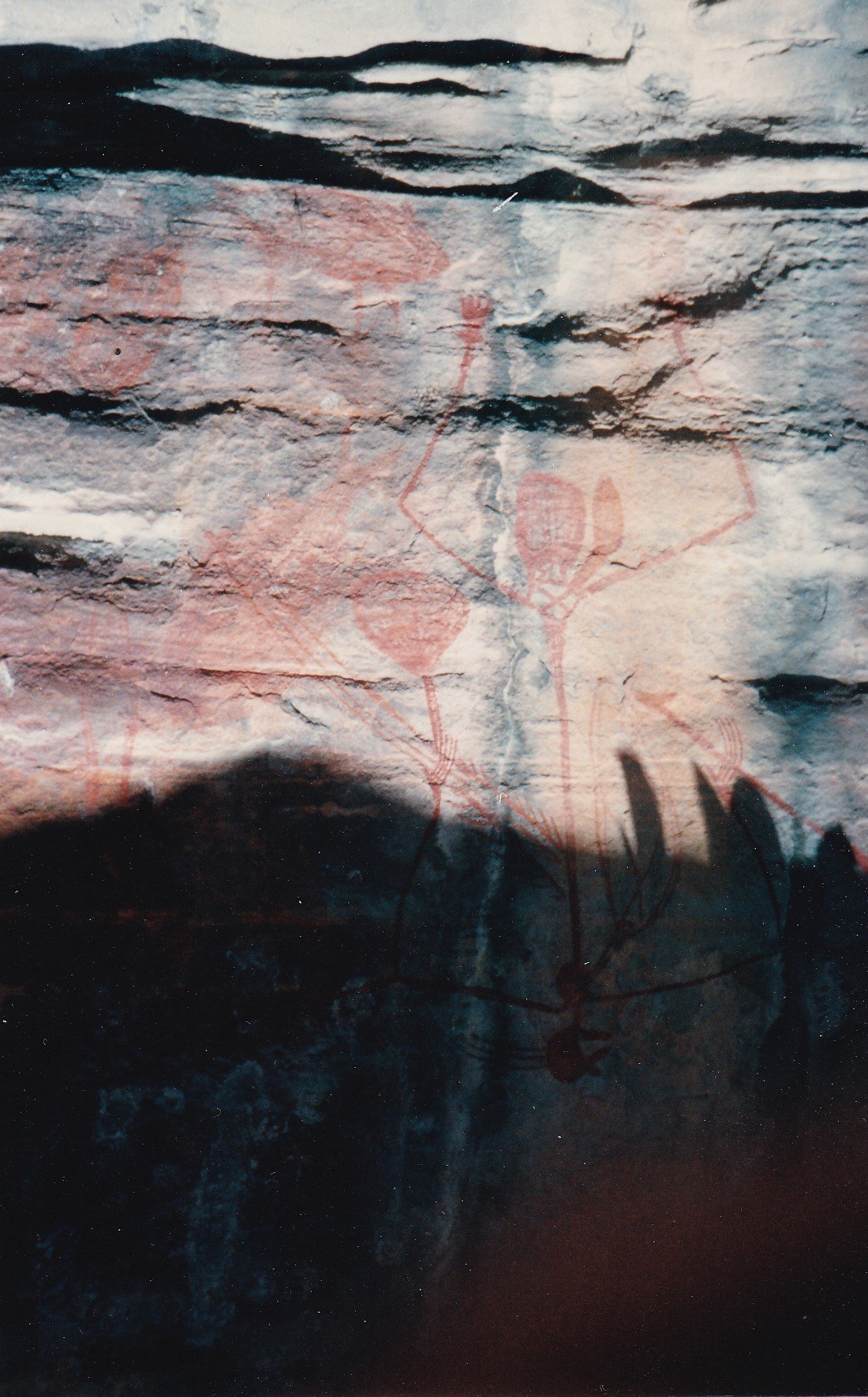 Up very early to go on morning cruise on Yellow Waters. Beautiful birds – named 26 species. Saw several crocodiles. Green native cress each side of billabong. Came back for breakfast at 9:00. Then loaded in Morris’s air conditioned vehicle and went to Jabiru, 1 hour waiting around shopping centre, pleasant and cool. Up to Ubirr Rock. Good art and view 360 degrees. Took panarama photo but ran out of film half way through. Shot took in ‘Hoges back yard’. Then we came back to Nourlangie Rock which also had good art Lightening Man and Barramundi, his wife and another. Home to Cooinda, mossquitoes very bad again.