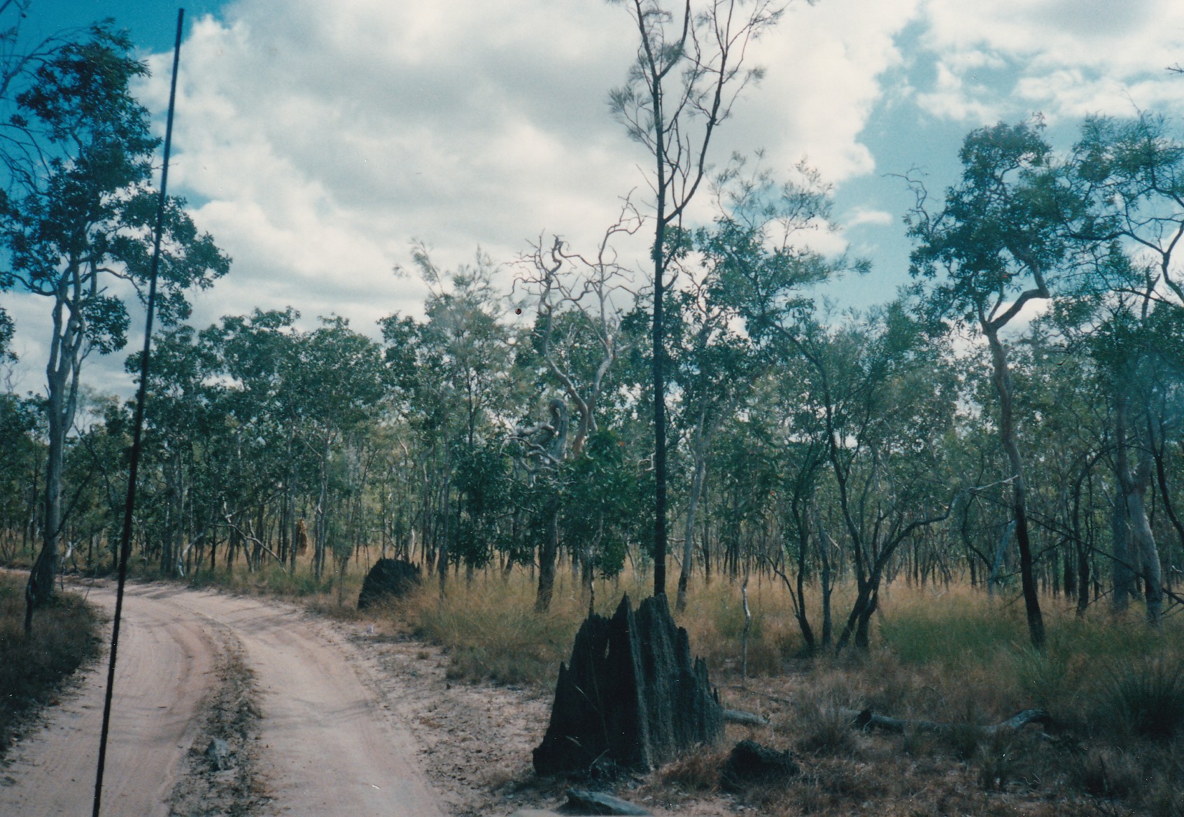 Beautiful morning. Earnest preparations, perhaps even nervous. Set off on reasonable road, short discussion on road to Mainoru. Using Joint Operations map, very good, almost follow each turn of the road. 1:20 at Bulman then out into the wild bush. Track reasonable, but full of surprises needed concentration. In river and creek valleys, thick with palms, few flowers. Lunch at a clearing interesting patterns on the tree bark. Start again at 3:30. At 5:30 reached Emu Springs. Camped by a thermal pool. Lovely night. Good sleep, bathed in pool.
