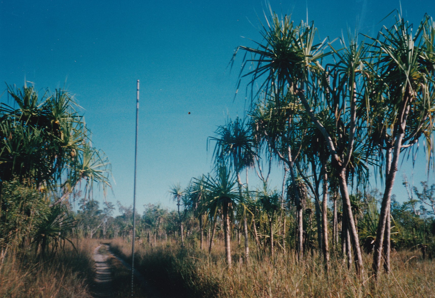 Beautiful morning. Earnest preparations, perhaps even nervous. Set off on reasonable road, short discussion on road to Mainoru. Using Joint Operations map, very good, almost follow each turn of the road. 1:20 at Bulman then out into the wild bush. Track reasonable, but full of surprises needed concentration. In river and creek valleys, thick with palms, few flowers. Lunch at a clearing interesting patterns on the tree bark. Start again at 3:30. At 5:30 reached Emu Springs. Camped by a thermal pool. Lovely night. Good sleep, bathed in pool.