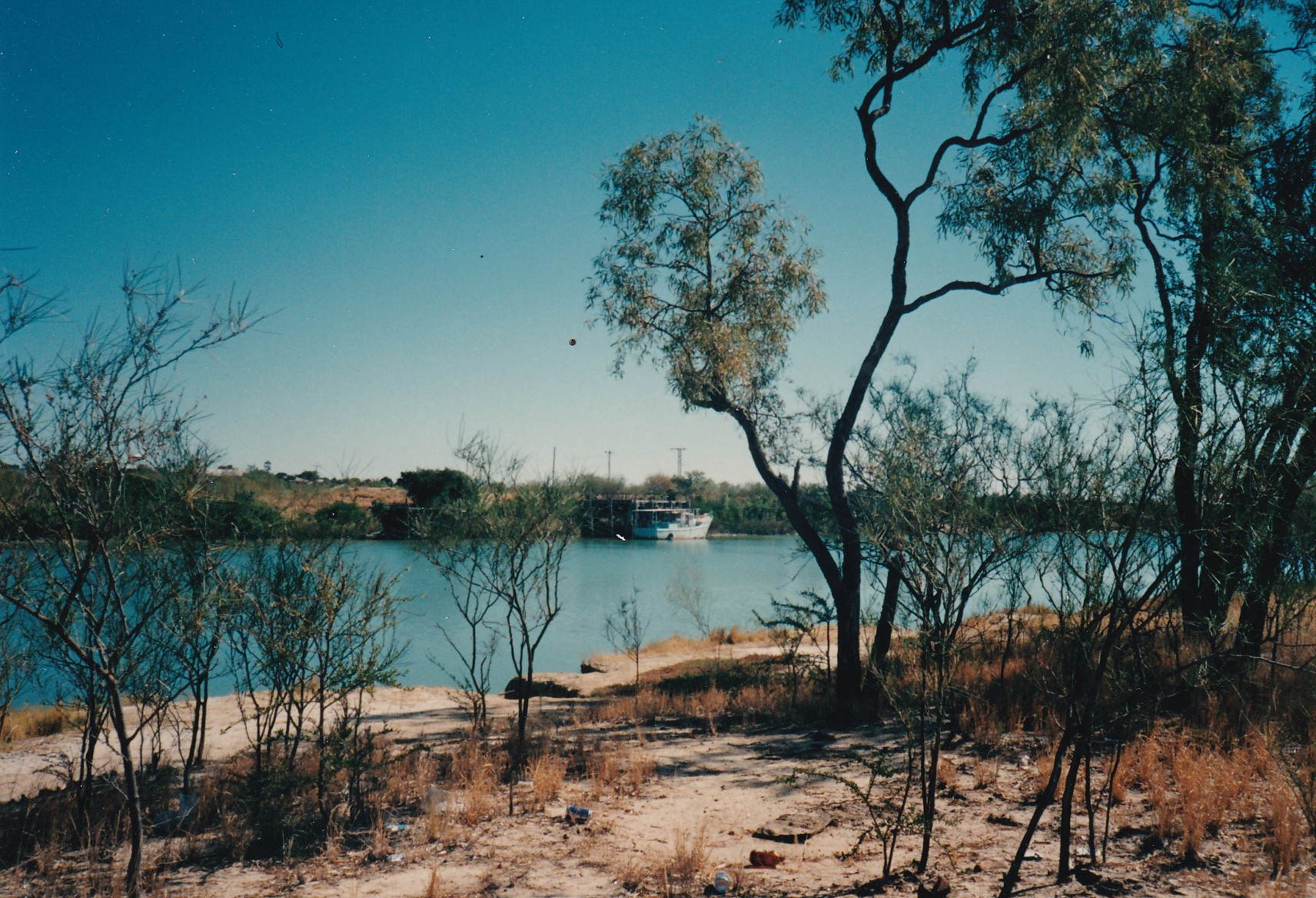 Bought our didgeredoo, boomerang and set off to Mataranka. Saw graves of the Never Never and springs were beautiful but crowded with tourists. Had lunch at Roper Bar at 2:00. Hot but shady and plenty of running water. Went to Roper Bar Store, not a great selection of goods. Very muddled service. Main person was ill, Things a litle tense between Morris and Leigh. Morris being typical old woman and Leigh counter acting on the defensive and being high handed. Hope it settles down. Lovely drive after Roper Bar to Towns River. Different vegetation. More lush and more variety of plants. Viewed Roper River very wide and deep and salt at this stage. Camped at Towns river lovely lazy crossing and wide sandy banks, paper barks and palms around. Good night but mozzies threatening.