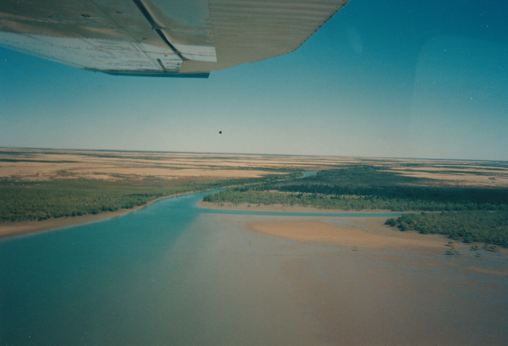 Brolgas, peacocks and other birds wandering the park. Wallaby came in for tea. Went down to see the cattle unloaded from a road train. Cow broke its leg, angry steer. Trailer wheel slightly beaten in, Leigh changed tyres. Tyre on troop carrier abraided on the inside, he had to put the spare on. Went for a flight in a Cessna at lunchtime. Right up to the coast and out over islands then back again. Great view of rivers and billabongs mangroves great stretches of sandy flats. Pilot, Simon, was very nice and probably very lonely. I crept away after lunch found a shady spot and read and slept a bit. Wallabies hopped past to have a little stare. Then a lady from the DC3 came along and had quite a long chat. Nice to be away for a while. Probably could have done a few odd jobs but I needed a break. We went to the Saturday night Barbeque which was very good food. Beef ribs, barra wings, rissoles, and salads. Apple sponge. It got cold so people went home or into the bar. Fellow lit the fire with kero copper flu was red hot for 3 feet up. Open air absorbed the heat.