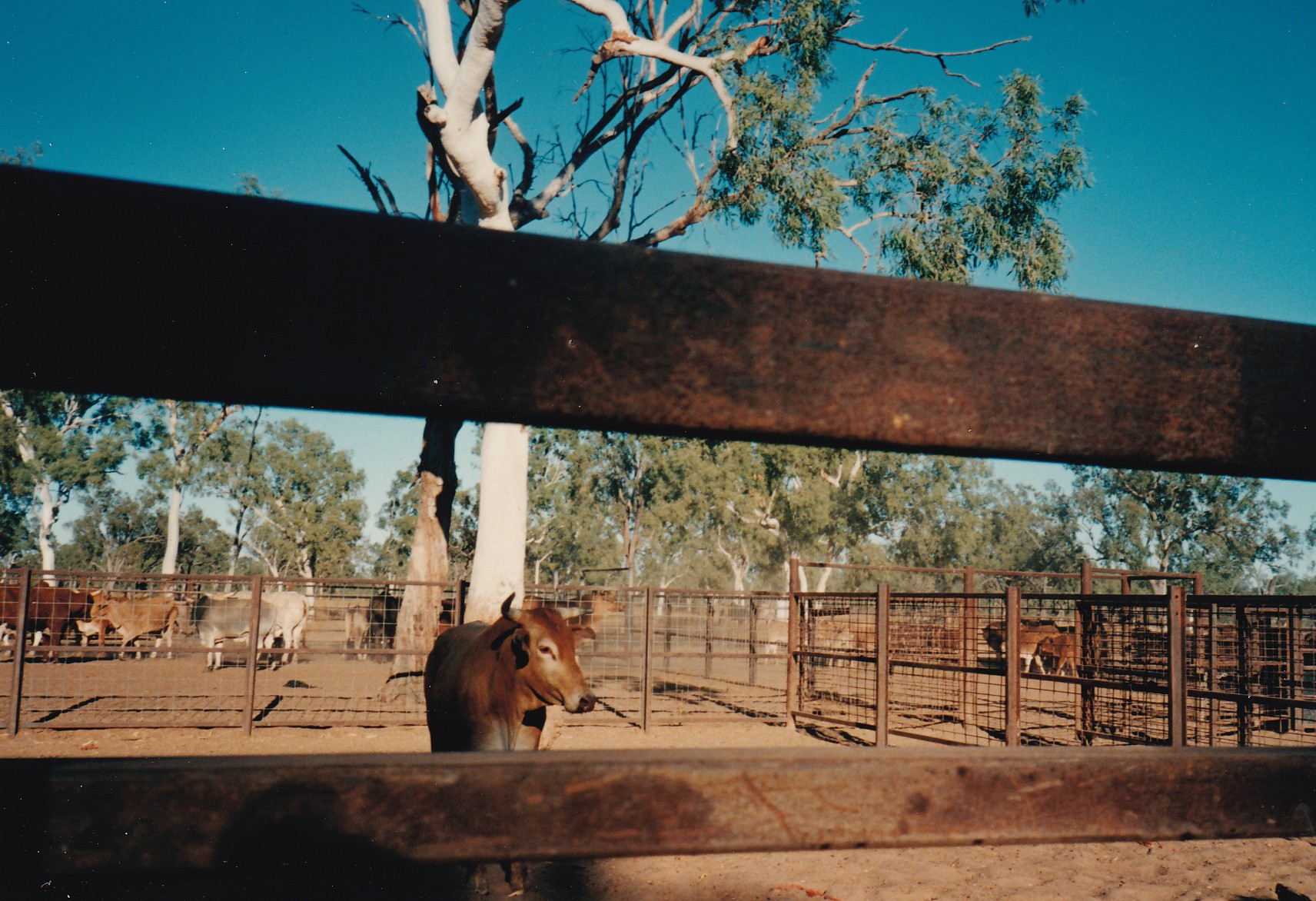 Brolgas, peacocks and other birds wandering the park. Wallaby came in for tea. Went down to see the cattle unloaded from a road train. Cow broke its leg, angry steer. Trailer wheel slightly beaten in, Leigh changed tyres. Tyre on troop carrier abraided on the inside, he had to put the spare on. Went for a flight in a Cessna at lunchtime. Right up to the coast and out over islands then back again. Great view of rivers and billabongs mangroves great stretches of sandy flats. Pilot, Simon, was very nice and probably very lonely. I crept away after lunch found a shady spot and read and slept a bit. Wallabies hopped past to have a little stare. Then a lady from the DC3 came along and had quite a long chat. Nice to be away for a while. Probably could have done a few odd jobs but I needed a break. We went to the Saturday night Barbeque which was very good food. Beef ribs, barra wings, rissoles, and salads. Apple sponge. It got cold so people went home or into the bar. Fellow lit the fire with kero copper flu was red hot for 3 feet up. Open air absorbed the heat.