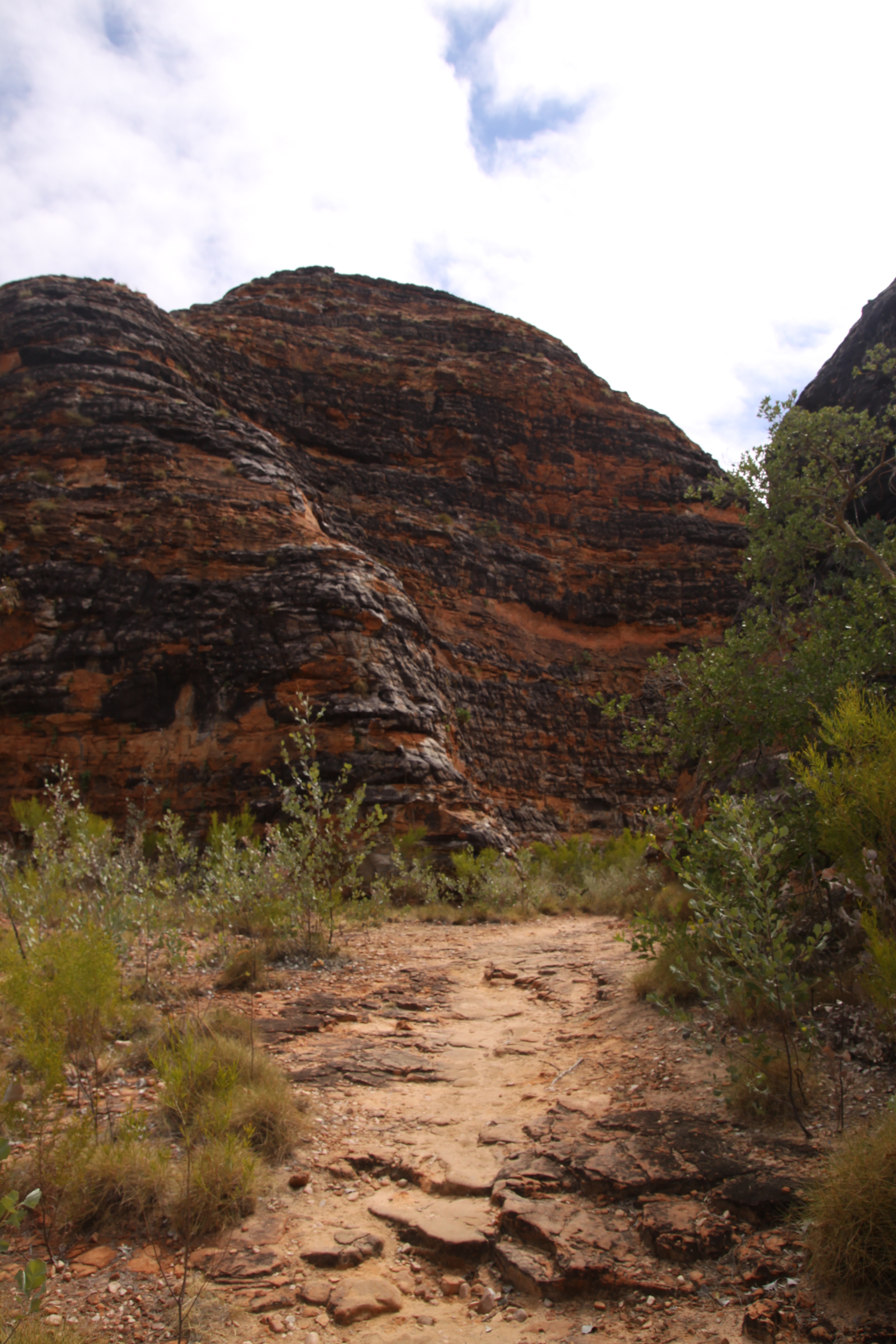 Left Fitzroy Crossing on the 13th. Investigated one possible wayside stop at Margaret River but looked crowded at 1pm, interesting bridge forms the entrance more like a broken down causeway. Spent little time in Halls Creek – looked like a fairly rough town lots of mesh. Passed the top end of the Tanami track – sign said it was closed due to recent rain. Finished the day at the privately run station stay style caravan park at the entrance to the Bungle Bungles (Purnululu National Park). Basic facilities, each bathroom building houses two bathrooms, corrugated iron walls, no lining and no roof, each bathroom has solar powered light, toilet and shower with no dividers, if your lucky the gas cylinder provided for each buildings hot water is still charged.