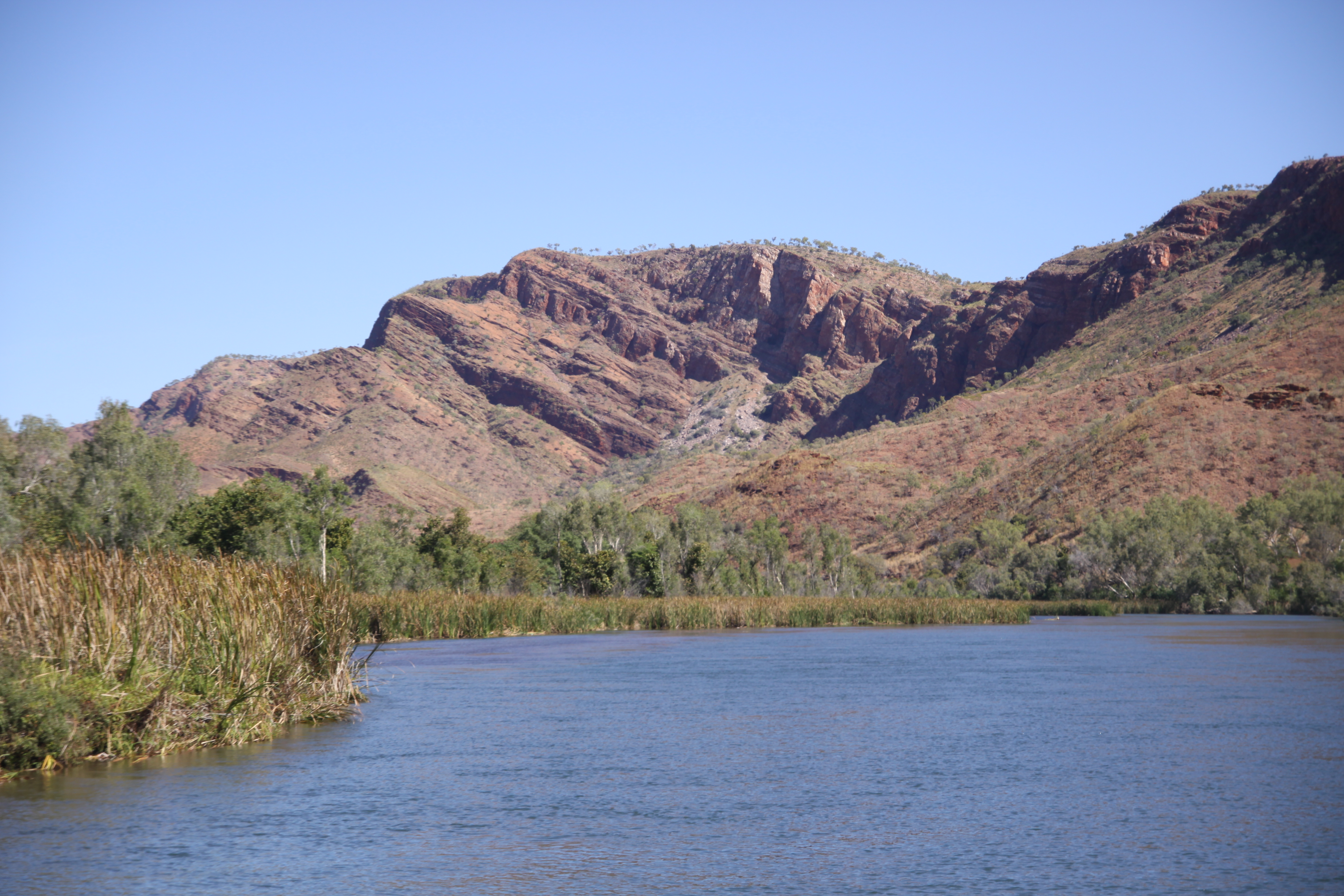 Leisurely Boat trip today up the Ord river, otherwise known as Lake Kununurra, to the Argyle Dam and back. At the start of our trip is the Ord Diversion Dam which keeps the stretch of river we are on at a relatively even height all year round. The trip is 55km in each direction. Lots of fresh water crocodiles but hard to see and photograph. As you get further upstream the rock canyons get more and more majestic and awesome. The bird life is prolific and we diverge up small creeks to observe many types of water birds and others.