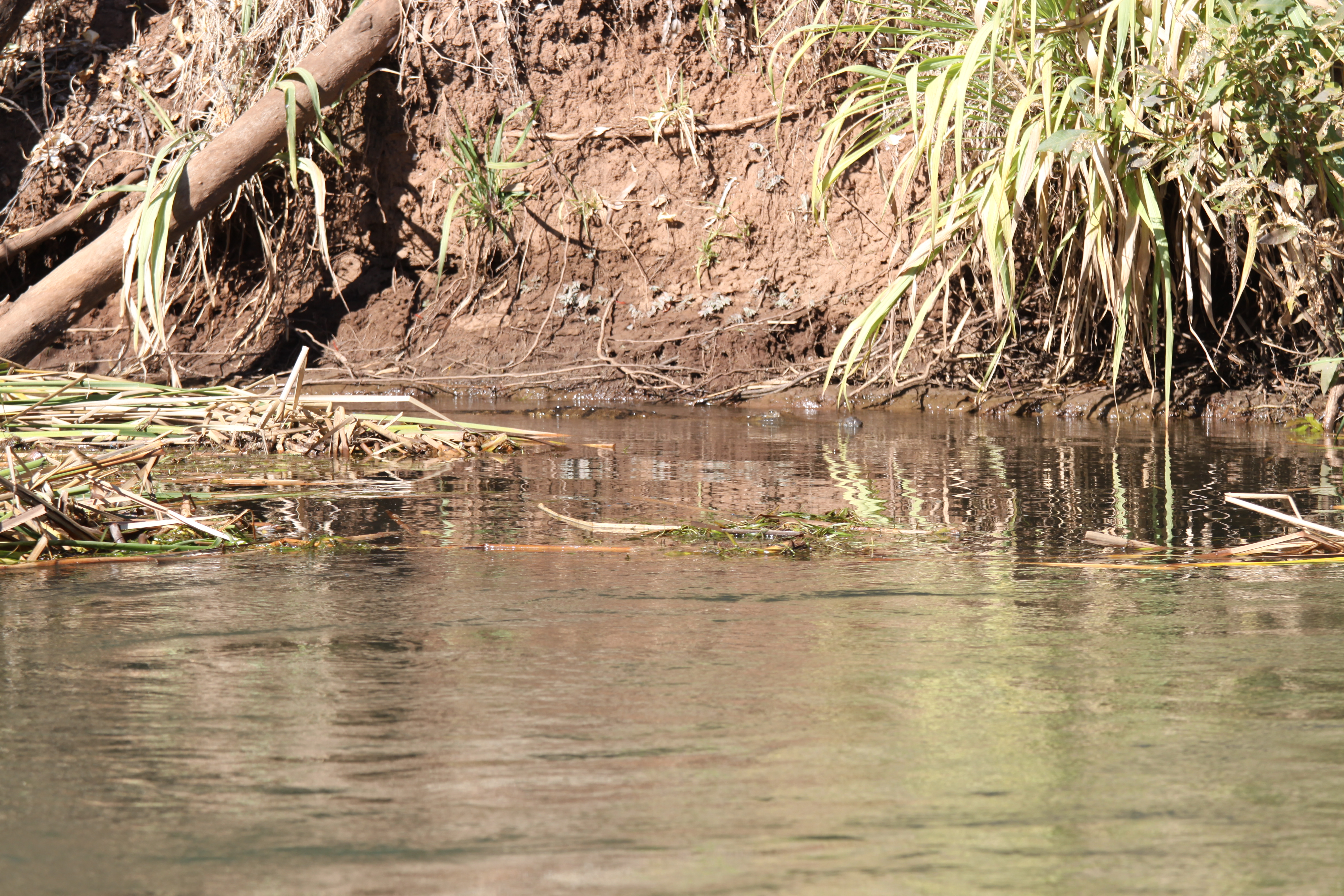 Difficult to see but just below the water near the bank lurks a crocodile.
